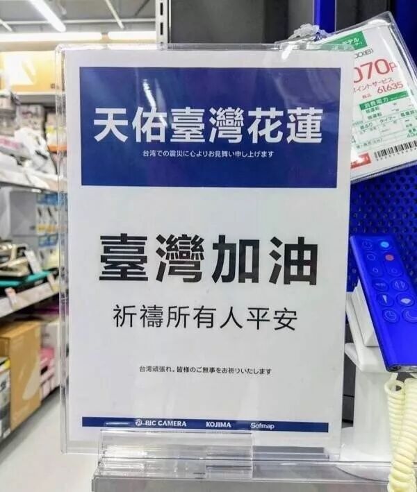 日本超市挂起了“台湾加油,祈祷所有人平安的牌子”