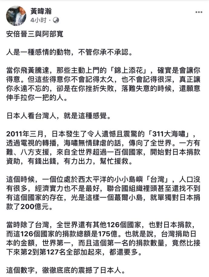 日本首相安培晋三得知台湾花莲地震后,第一时间上Facebook表示支持,并用毛笔写下了“台湾加油”四个汉字: