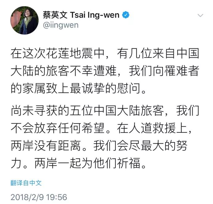 反观对岸,蔡英文说:“在这次花莲地震中,有几位来自中国大陆的旅客不幸遭难,我们向罹难者的家属致上最诚挚的慰问。尚未寻获的五位中国大陆旅客,我们不会放弃任何希望。在人道救援上,两岸没有距离。我们会尽最大的努力。两岸一起为他们祈福。”