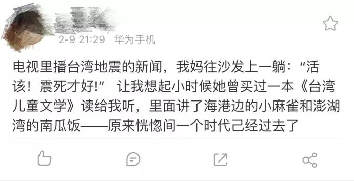 然而,我这几天在社交网站上,却完全不能看台湾地震新闻底下的评论,一大群非人类在欢呼叫好,群魔乱舞。你以为这只是一小部分极端人士的狂欢吗?反复刷屏吗?不是的,这是社会大气候的反映,经过这些年的仇恨教育,我们的族群确实是在返祖,我们的社会离文明更远了。