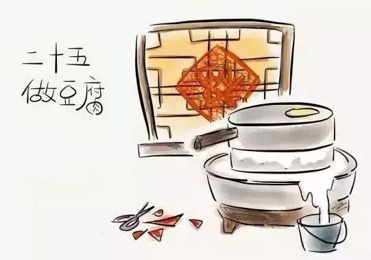 “揉沫过箩去渣,煮沸点浆成块”,推磨做豆腐。传说玉帝会下界查访,吃豆腐渣以表清苦。二十五磨豆腐,寓意年过得富富余余,来年的生活也富富余余。