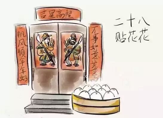 打糕蒸馍贴花。古人以桃木为辟邪之木,后被红纸代替。这天要贴窗花了啊。