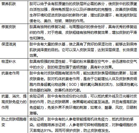 1.改善皮肤营养状况 大家都知道,皮肤的主要蛋白成分是胶原,人体合成胶原所需要的原料以甘氨酸、脯氨酸、羟脯氨酸为最多,小分子活性肽是富含这些氨基酸的氮源营养物质,而且这些氨基酸多以短肽形式存在,吸收迅速,是普通的日常膳食所不能比的。平常适当食用一定量的小分子活性肽可以作为日常膳食的有效营养补充,是非常必要的。这是皮肤健康状况发生改善的主要物质基础。