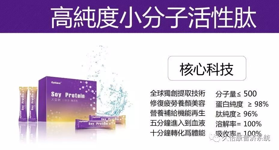 小分子肽,平均分子量小于500道尔顿,具有快速吸收、完整吸收、穿透吸收等特性,较同类产品在功能功效上均有大幅提升。